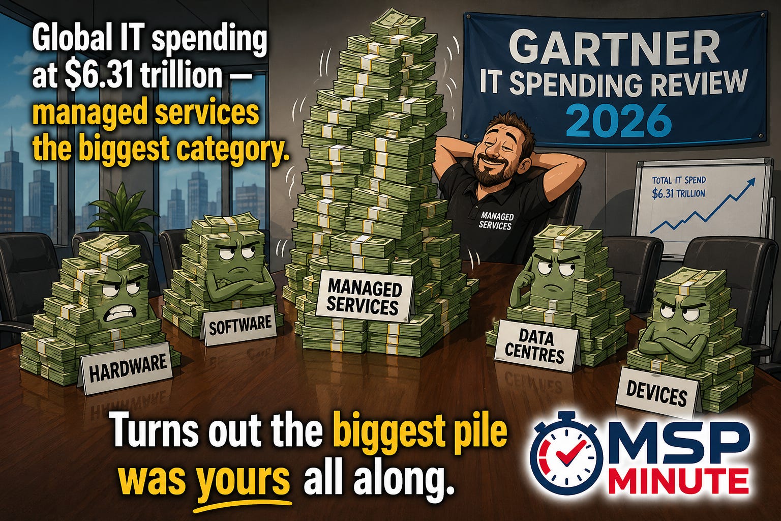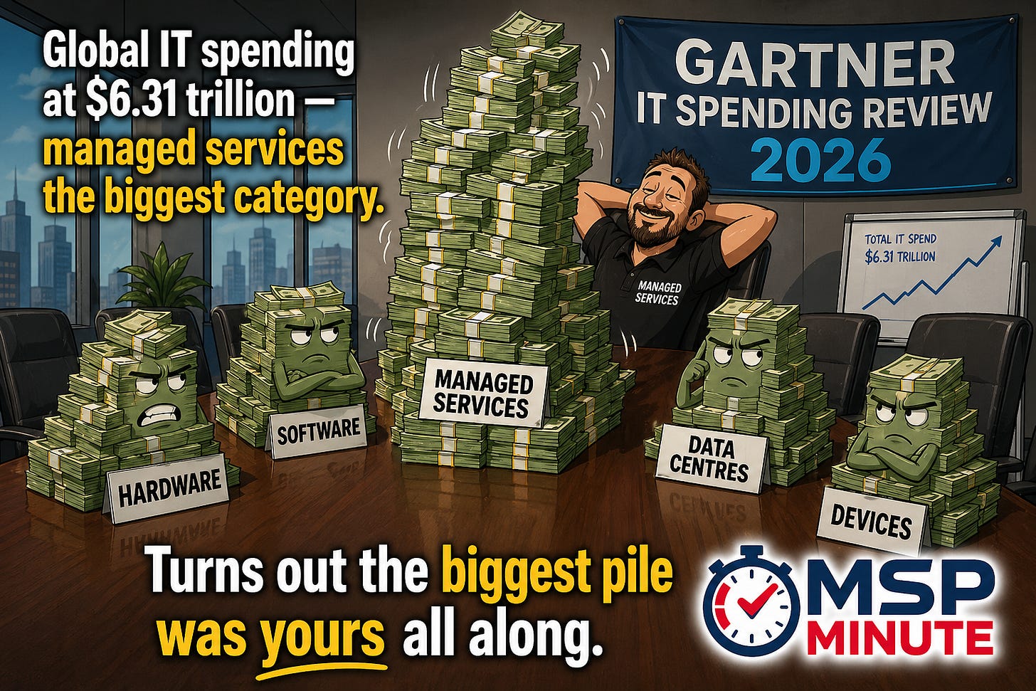 KERCHING!! The revision is being driven by AI infrastructure investment. But the number that matters most for MSPs is this: IT services, the category that includes managed services, is the single largest spending segment of all at $1.87 trillion.